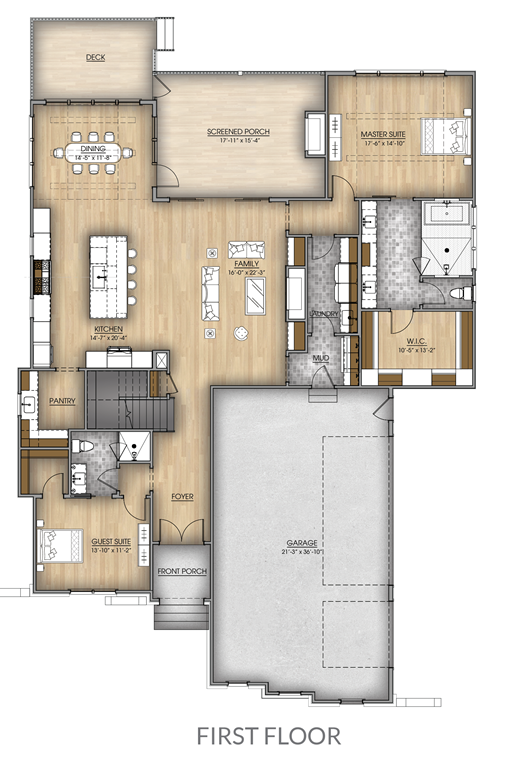The primary suite is privately located on the first floor, offering a peaceful retreat with a luxurious bath and a large walk-in closet. A laundry room is conveniently positioned just outside the primary closet, making everyday routines a breeze. A first-floor guest suite provides flexibility for visitors or multigenerational living.