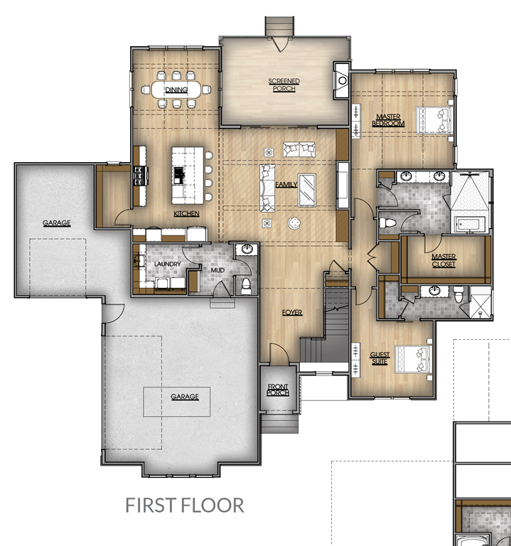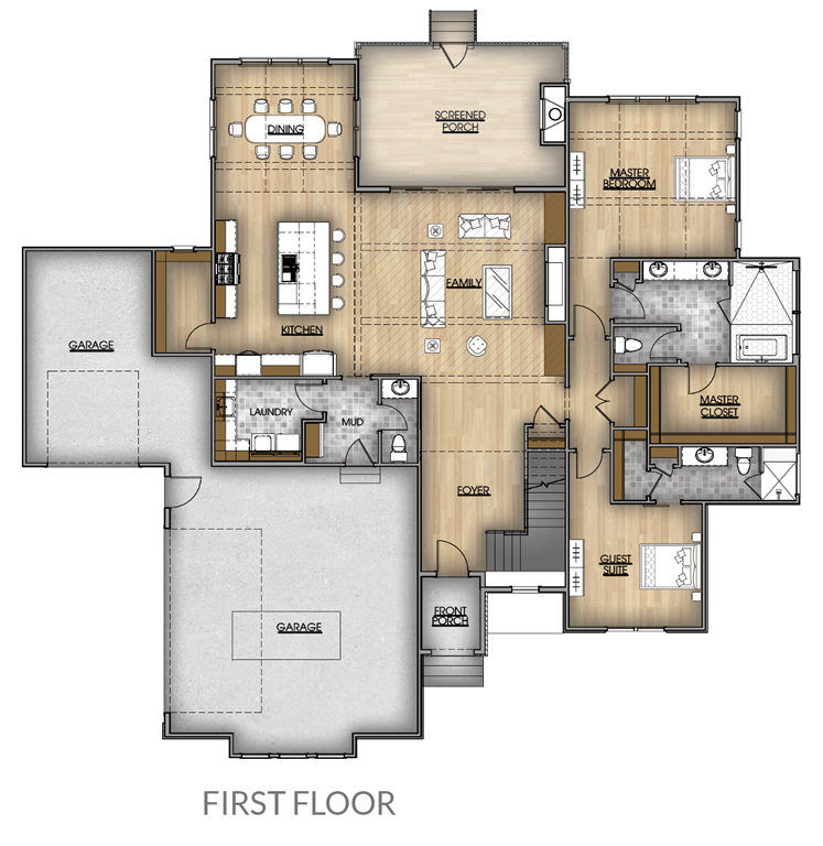 A welcoming front porch leads into a spacious foyer, setting the tone for the open-concept design. Just beyond, the family room features a cozy fireplace and flows seamlessly into the kitchen, where you’ll find a large island, walk-in pantry, and easy access to the mudroom and laundry room. The screened porch off the family room provides a peaceful spot for outdoor relaxation in any season.