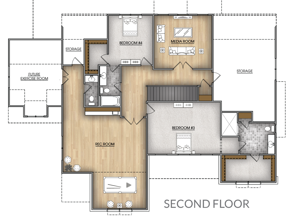 Upstairs, you'll find an expansive media room, future exercise room, and a versatile recreation room with its own powder bath—plus generous walk-in storage to keep everything in its place.