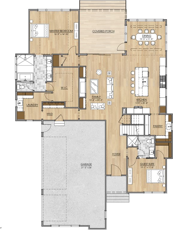 The kitchen includes a large island and connects effortlessly to the dining room, which opens onto a covered porch—ideal for entertaining or enjoying quiet evenings outdoors. A mudroom off the garage provides practical storage and organization.