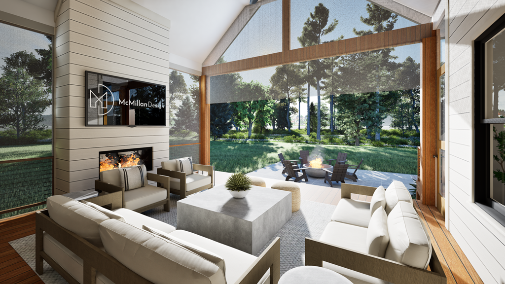 The main floor features a three-car garage, an inviting owner’s suite with a vaulted ceiling, and a spa-inspired bathshowcasing a stunning wet area with a freestanding tub and serenity shower. The walk-in closet conveniently connects to the laundry room for everyday ease. A guest suite, private study, and open-concept living area—including a spacious family room, dining area, and large kitchen island—create an ideal space for gathering. A pantry/scullery adds extra storage and prep space, while the screened porch with fireplace, adjacent deck with a convenient dog shower, and thoughtful dog nook under the stairwell make indoor-outdoor living and pet care effortless.